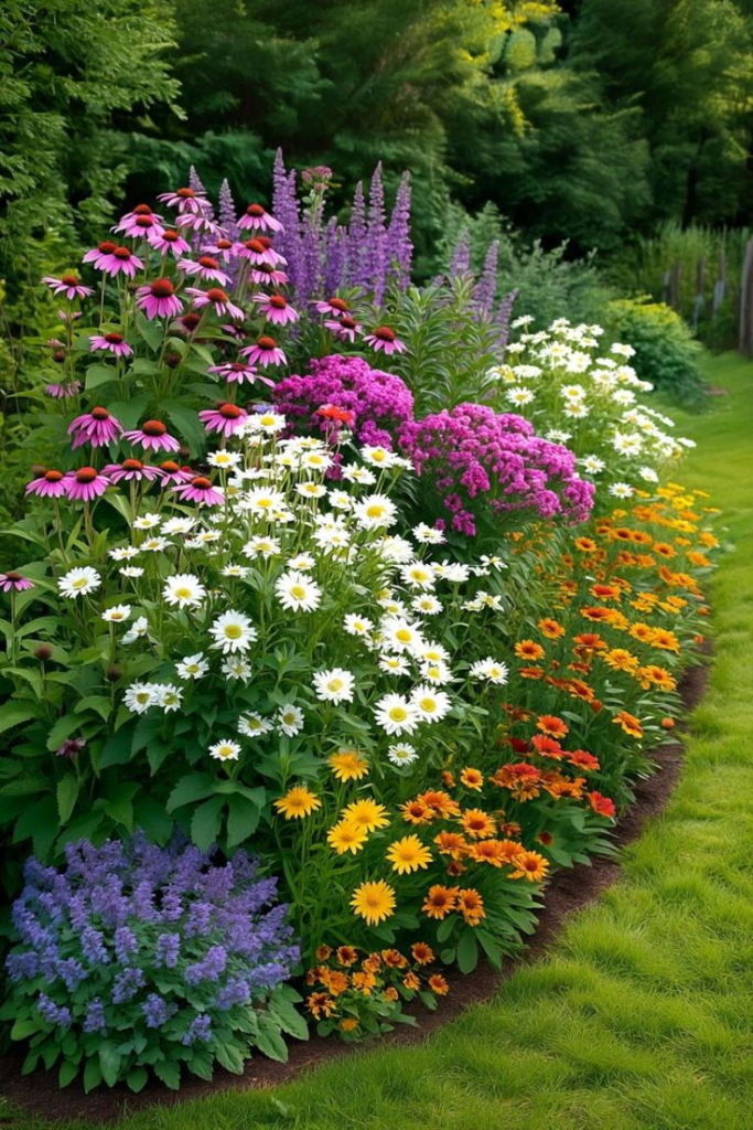 This flower bed idea is reminiscent of a classic country garden. The flowers and shrubs are arranged in a loose, naturalistic way, while the white picket fence adds a touch of formality.