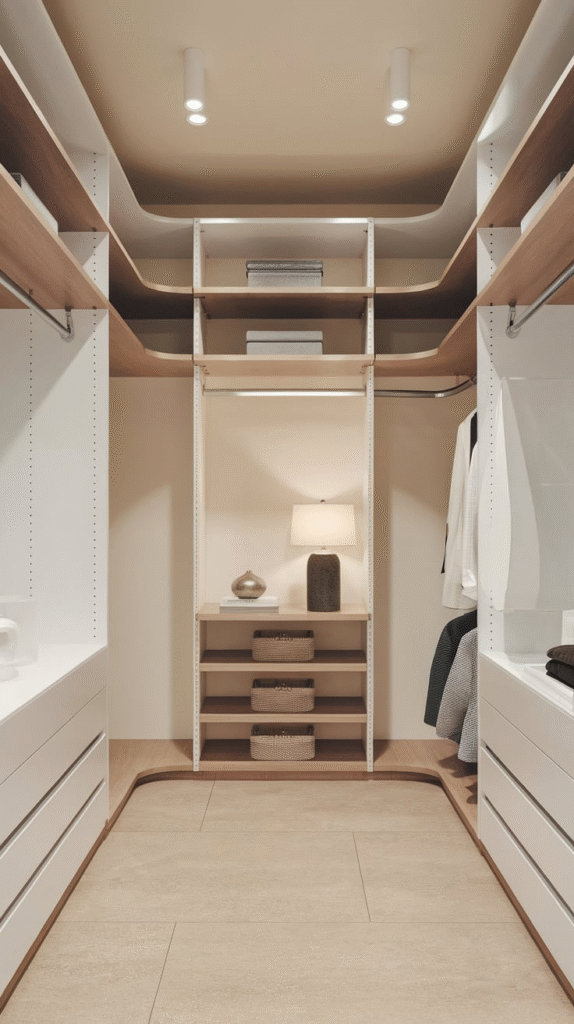 Those awkward corners in your closet? They’re not dead space; they’re hidden real estate. Install triangular or curved shelves in corners to make use of every inch. Perfect for storing accessories, shoes, or decorative storage bins.